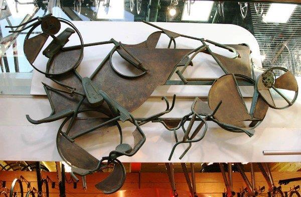 “Steeplechase”, Welded Steel and Bycicle Parts, Painted. Installation: United Cycle, Edmonton, Alberta Artwork commissioned by United Cycle.